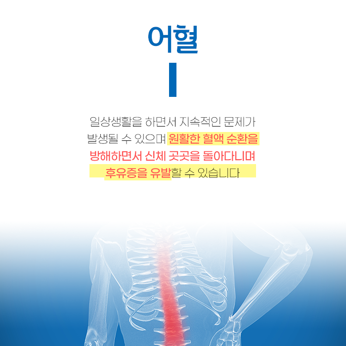 이때 손상된 근육과 인대에서 부기, 염증, 긴장이 발생하며 며칠 뒤에 나타나는 심한 불편의 원인이 되는 것입니다. 외부 충격은 몸의 기혈 순환을 방해하고 혈액이 제자리를 벗어나 뭉쳐 어혈을 형성하게 합니다. 어혈이란 혈액이 원활히 흐르지 못하고 한곳에 정체된 상태를 뜻하며 순환 장애의 원인이 됩니다.