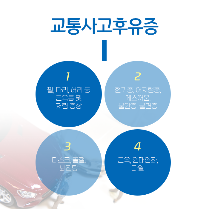 교통사고가 일어나면 겉으로 외상이 드러나지 않더라도 차량 충돌이나 차체가 미끄러지고 회전하는 과정에서 발생한 충격 에너지는 몸 조직에 미세한 손상을 남길 수 있습니다. 사고 순간 몸은 예상치 못한 방향으로 뒤틀리거나 강한 힘에 노출되기 때문입니다.