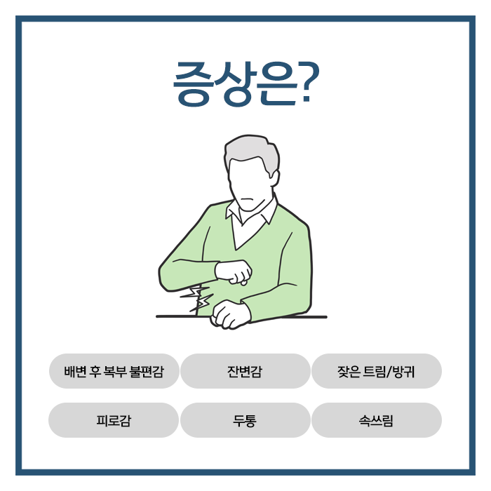 장시간 화장실에 앉아 과도하게 힘을 주다 보면 치질 발생 위험이 높아질 수 있으므로 주의가 필요합니다. 설사형은 배변 후에도 속이 시원하지 않고 계속해서 변이 남아있는 듯한 느낌이 특징입니다. 변의가 급박하게 찾아와 화장실을 자주 가야 하며 외출 중에도 불안감을 느끼게 만드는 주범이 됩니다. 혼합형은 환자를 힘들게 하는 유형 중 하나로 규칙 없이 교대로 반복되는 상태를 말합니다.