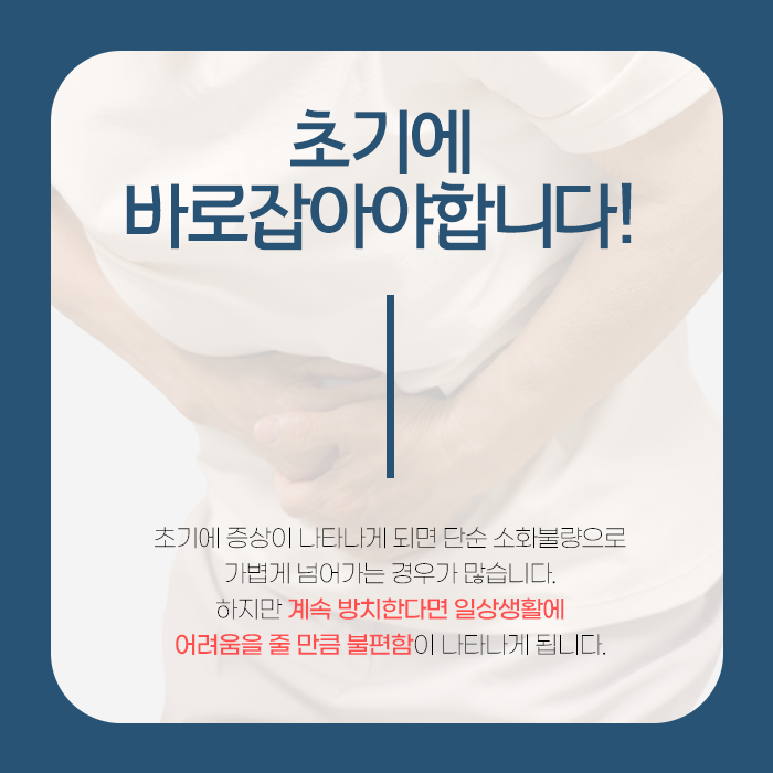 식사 후 반복되는 통증, 화장실을 들락날락하게 만드는 잦은 설사 등 배변 관련 불편함이 끊이지 않고 계속되고 있다면 과민성대장증후군일 수 있습니다. 제때 치료하지 않고 방치하게 되면 시간이 지날수록 장의 예민함은 더욱 심해지고 증상 관리도 어려워져 만성적인 상태로 진행될 수 있습니다. 장은 스트레스와 감정에 민감하게 반응하기 때문에 심리적인 압박이 증상을 악화시키는 악순환이 발생하기도 합니다.