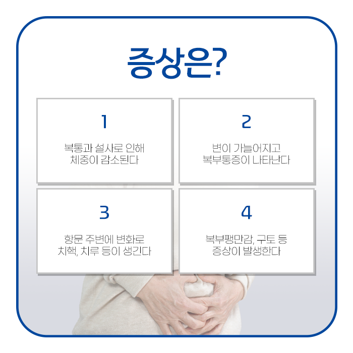 가장 흔한 증상으로 하루에도 여러 차례 심한 설사, 방화동 변이 가늘어짐 나타나고 통증은 하복부나 복부 전반에 걸쳐 느껴지는 경우가 많습니다. 설사와 함께 혈액이 나오기도 합니다. 염증으로 인해 장에서 영양분 흡수가 제대로 이루어지지 않거나 불편함으로 인해 식사를 꺼리게 되면서 체중감소가 나타납니다. 염증이 지속되면서 심한 피로감이 느껴집니다.