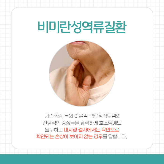 방화동 비미란성역류질환입니다. 이 유형은 가슴 쓰림, 목의 이물감, 역류성식도염의 전형적인 증상들을 명확하게 호소함에도 불구하고 내시경 검사에서는 육안으로 확인되는 손상이 보이지 않는 경우를 말합니다.
