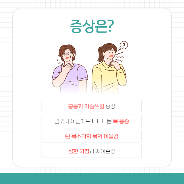 인후와 가슴 하부에서 내용물이 역류하는 질환은 목에 무엇인가 걸린 듯한 이물감과 함께 숨 막히는 듯한 가슴통증을 유발하는 원인 중 하나입니다. 식도 점막을 자극하고 염증을 일으켜 여러 불편한 증상들을 유발하는 질환을 위식도역류질환이라고 합니다. 이 질환은 크게 두 가지 주요 형태로 나눌 수 있습니다.