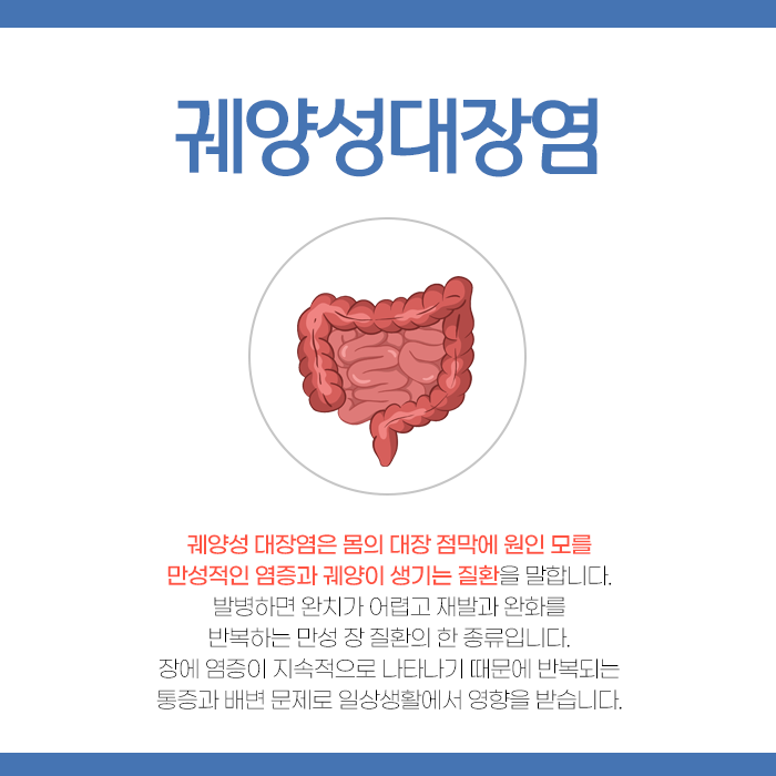 질병이 초기에는 다른 소화기 질환과 증상이 유사하여 식별하기 어렵다는 특징과 무관하지 않습니다. 대장염은 대장 점막층에 만성적인 염증 반응이 끊이지 않고 반복적으로 발생하는 질병으로 궤양을 특징적으로 동반하는 질환입니다. 복통, 설사 등 다른 흔한 소화기계 질환과 증상이 유사하여 식별하기 어렵습니다.