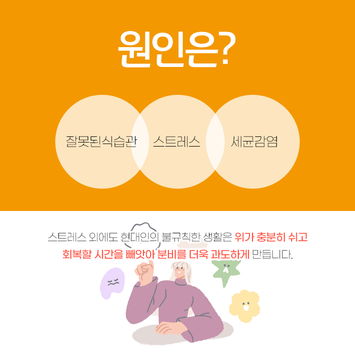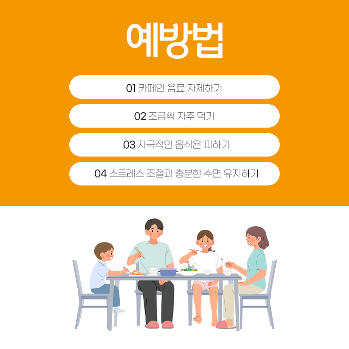 카페인은 위산 분비를 촉진하며 알코올 역시 위 점막에 손상을 주어 자극을 가중시킵니다. 식사 시간을 거르거나 과식을 반복하는 경우 위에 음식물이 장시간 남아있어 소화되지 않은 음식이 위산 분비를 유발하며 기능 저하를 불러올 수 있습니다.