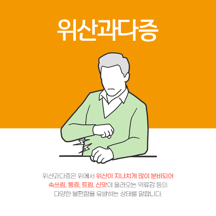 장기간 방치하면 역류성식도염, 위염 등이 발생할 위험이 큽니다. 위산과다증은 일시적이고 급성으로 증상이 나타나기도 하지만 생활습관이나 만성 질환에 의해 지속적으로 재발하는 경우가 많습니다. 공복 시 속쓰림이 심하고 음식을 섭취할 때 증상이 완화되는 경향이 있습니다.