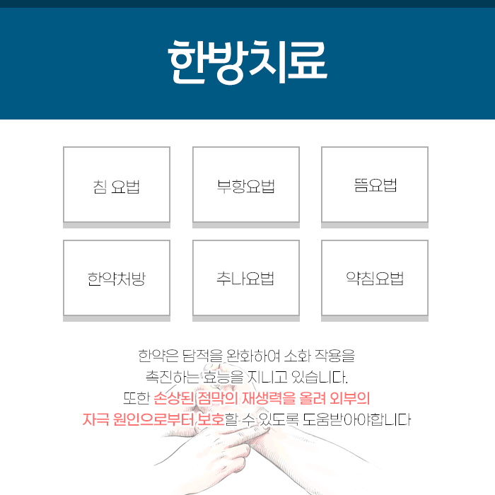 침치료와 약침치료는 위장의 긴장을 완화하는 데에 도움을 줍니다. 공복에도 계속되는 윗배 답답함과 무거움으로 고생하시는 분들은 담적이 형성되어 위장의 기운 흐름이 막혔을 가능성이 있으므로 조기에 검사를 받고 치료를 받는 것이 중요합니다.