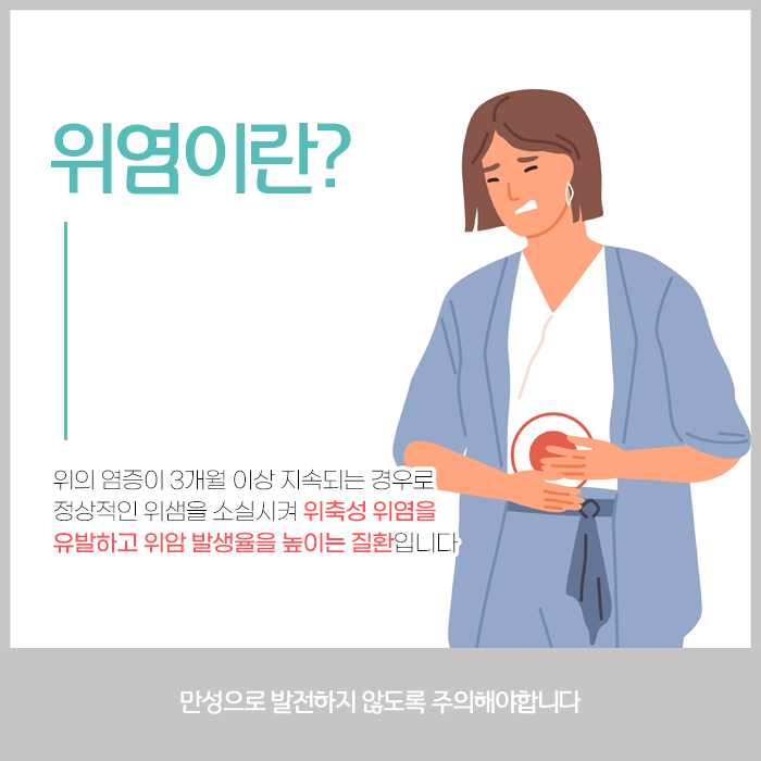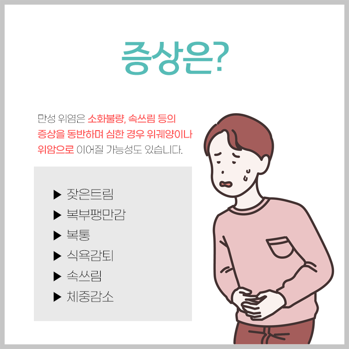 위산 분비 저하로 인해 음식물 소화력이 떨어지기 때문입니다. 기름지거나 짜고 매운 음식을 먹으면 소화가 잘 안 되는 듯한 느낌이 들고 입맛이 없어지며 메스꺼움이나 구토 증상이 생기기도 합니다. 위염 환자 중에는 특별한 증상을 느끼지 못하는 경우도 많지만 식욕 감퇴, 메스꺼움, 복부 팽만감, 피로감, 쇠약감 등 다양한 증상을 경험할 수 있습니다.
