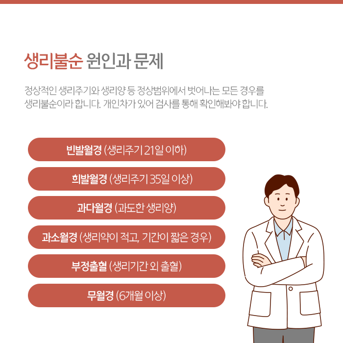 생리불순은 건강문제로 다양한 증상이 동반될 수 있습니다. 주기가 지나치게 짧아지거나 길어지기도 하며, 생리 기간이 아님에도 출혈이 발생하는 부정출혈과 함께 3개월 이상 생리를 하지 않는 무월경 상태가 지속되는 경우도 있습니다.