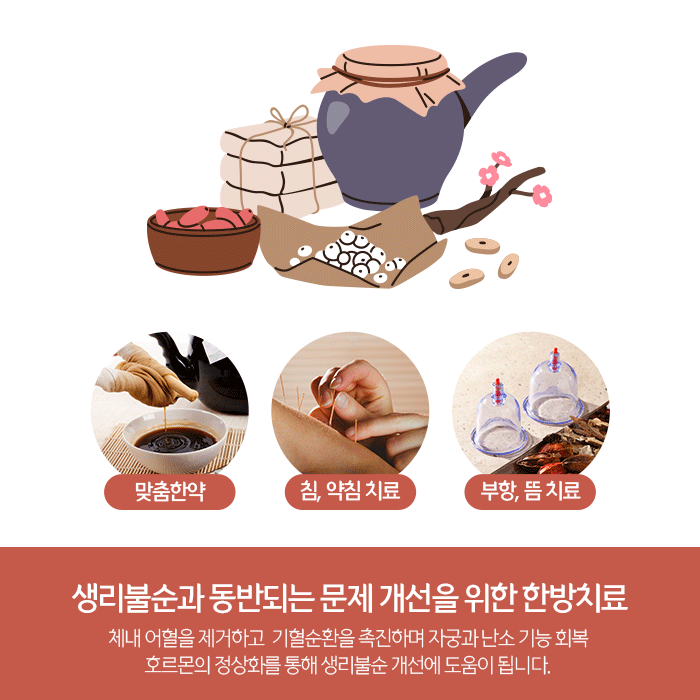 다량의 쑥을 활용한 뜸과 온열치료는 따뜻한 기운으로 어혈을 제거하며 원활한 기혈순환을 도와 호르몬 및 심신의 안정을 통해 생리불순을 개선합니다. 외에도 다양한 한방치료는 생리불순 원인과 동반되는 증상, 개인 체질과 건강상태, 생리통 원인에 따라 다르게 적용되므로 담당 의료진과 상담을 통해 확인할 수 있습니다.