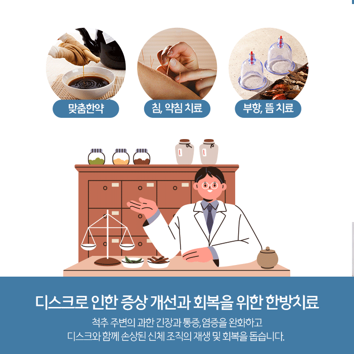 디스크 증상과 체질에 맞는 약재를 구성해 조제하는 한약은 어혈을 제거하고 기혈순환을 촉진해 손상된 디스크로 인한 증상 완화와 원활한 회복을 도와줍니다. 그리고 건강한 혈액을 생성해 면역력 향상과 전반적인 건강증진을 기대할 수 있습니다.