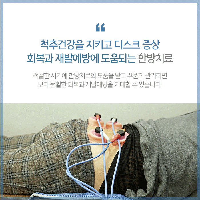 특히 요즘에는 과체중, 운동부족으로 인한 디스크 발생률이 높아지는 만큼 적정체중을 관리하고 규칙적으로 운동하는 것이 바람직합니다. 반복되는 허리통증을 줄이고 초기 디스크 회복을 위해 추나요법, 한약, 약침, 부항, 뜸 등의 복합적인 한방치료를 진행합니다.