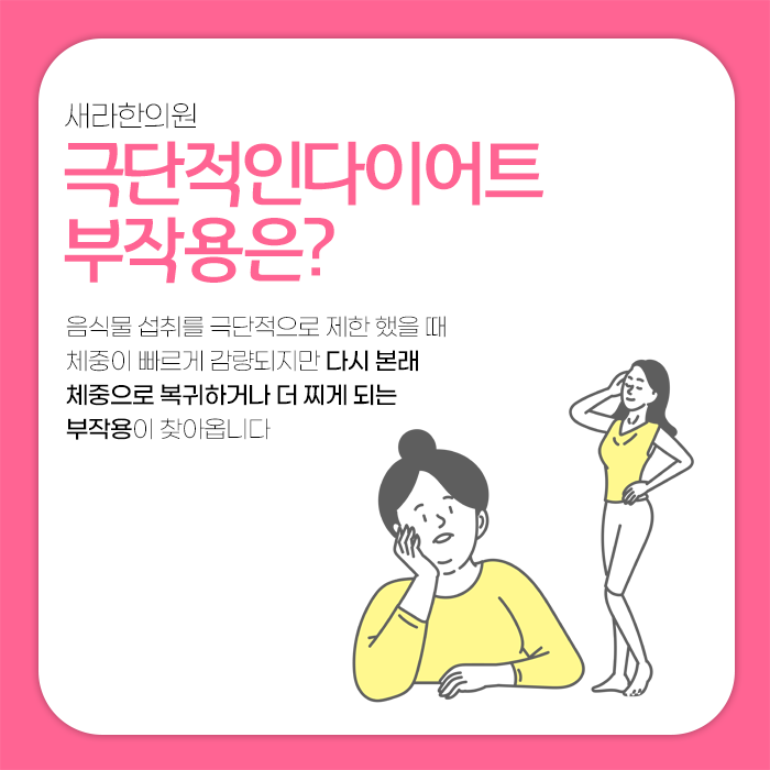 건강을 해치는 원인이 될 수 있으며 체중이 줄어든 후 원래의 식사량으로 돌아가면 다시 체중이 증가하는 악순환을 초래할 수 있습니다. 식사량을 극단적으로 줄이면 필요한 영양소를 충분히 공급받지 못하게 됩니다. 또한, 체중이 줄어든 후 본래의 식사량으로 돌아가면 다시 체중이 증가할 위험이 높습니다.