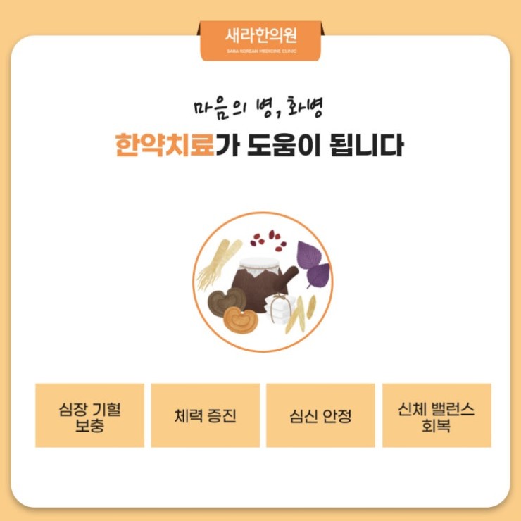 화병에 의한 증상은 정신적, 신체적 부분에 광범위하게 발생하게 됩니다. 정신적으로 민감성 증가, 지속적 짜증과 불안감, 우울한 기분 등의 감정적 불안정이 지속되고 감정 조절에 어려움을 겪어서 화를 내거나 분노를 쉽게 표출하는 경우가 빈번한데요. 감정의 과격한 변화로 지속적인 피로감을 호소하기도 합니다. 신체적인 측면에 스트레스가 소화기계 부정적 영향을 주면서 소화불량이나 두통을 일으키고 감정의 급격한 변화로 인해서 가슴 통증도 경험하게 됩니다. 더불어 식욕 부진이나 과식하는 등의 식사 문제로도 나타나게 됩니다.