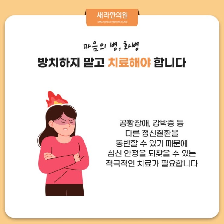 우리가 일상에 만나는 다양한 사람들의 관계 속에 겪게 되는 스트레스, 감정적 고통은 우리 마음을 더불어 몸에도 영향을 미칩니다. 이런 감정적 어려움이 단기간에 머물고 있다 사라진다면 큰 걱정거리가 되지 않을 수 있으나 만약 가슴 아픈 신체적 증상을 경험하면 이것이 바로 '화병'으로 알려진 상태에 비롯된 것일 수 있답니다. 화병은 감정적인 문제 이상으로 신체 여러 증상을 발생시킬 수 있는 심각한 상태로 이런 방화가슴통증치료 신호를 간과하시면 안 될 것입니다.