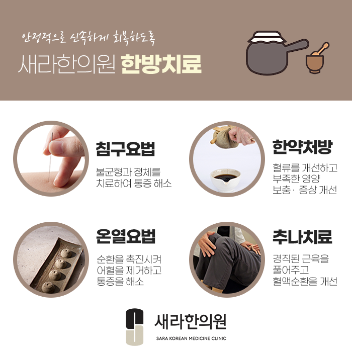 신체 상태를 개선해주고 건강을 회복하여 드리는 새라한의원에서는 침, 약침, 부항, 뜸, 한약처방, 추나치료 등과 같은 다양한 한방 시술이 진행된답니다.