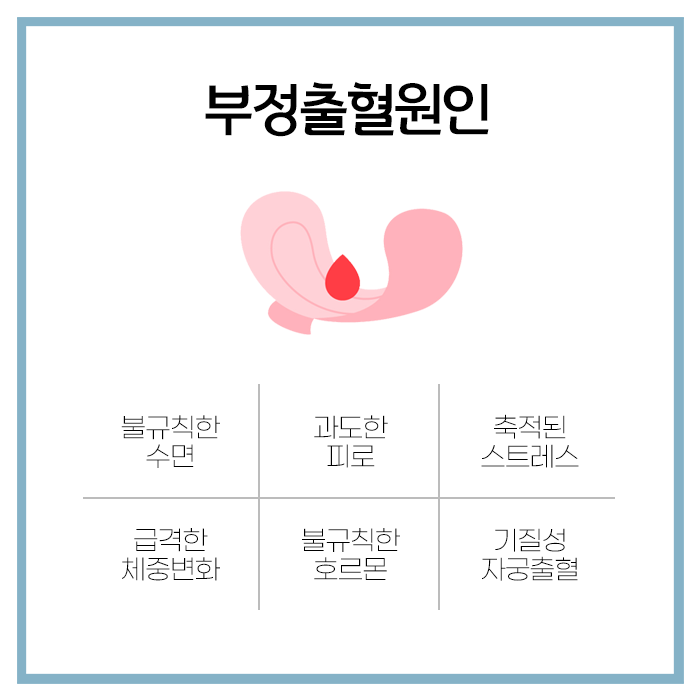 생리 기간이 아님에도 불구하고 출혈이 관찰된다면 신체 어딘가에 이상이 있다는 신호입니다. 방화부정출혈이 발생하는 원인은 다양하며 스트레스나 피로 때문이라고 치부하기 어려운 경우가 많습니다. 스트레스, 과로, 불규칙한 생활, 수면 부족, 호르몬 변화 등은 호르몬의 균형을 깨뜨려 부정출혈을 유발할 수 있습니다. 초기에는 특별한 증상이 나타나지 않다가도 월경이 끝난 뒤 출혈이 발생하거나 출혈 외 다른 증상이 뒤늦게 나타날 수 있으므로 세심한 주의가 필요합니다.