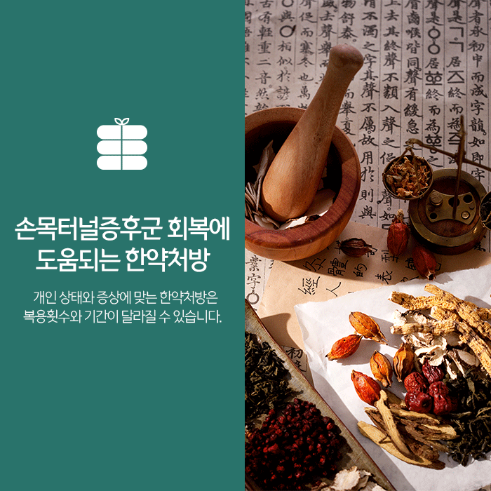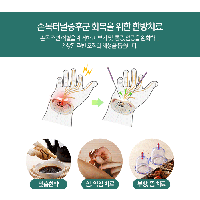또 건강한 혈액을 생성해 면역력 향상과 전반적인 건강증진을 기대할 수 있습니다. 처방드리는 한약은 환자분 건강상태에 따라 복용횟수와 기간이 달라질 수 있습니다. 침 치료를 통해 혈자리를 자극하면 손목주변의 신경자극을 줄이며 통증 및 염증완화에 도움이 됩니다.