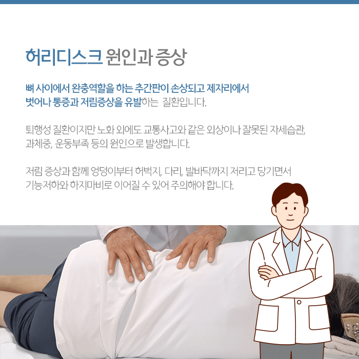 허리디스크는 요추 사이의 추간판이 돌출되어 나타나는 질환을 말합니니다. 외상이나 잘못된 자세 등으로 인해 추간판을 받치고 있는 인대 조직이 파열되면 요추 사이에 있던 추간판이 탈출하게 되어 발생합니다. 이렇게 탈출한 추간판이 신경을 눌러 다양한 증상을 유발합니다.