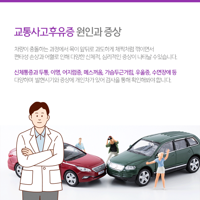 편타성 손상으로 인한 문제는 외상이 없다 해도 몸에 상당한 충격을 주게 됩니다. 이로 인해 발생하는 교통사고 후유증은 사고이후 발생하는 신체적, 심리적인 모든 증상을 말합니다. 발현시기와 증상에 개인차가 있기 때문에 사고 후 증상이 뚜렷하지 않아도 검사받아보는 것이 바람직합니다.