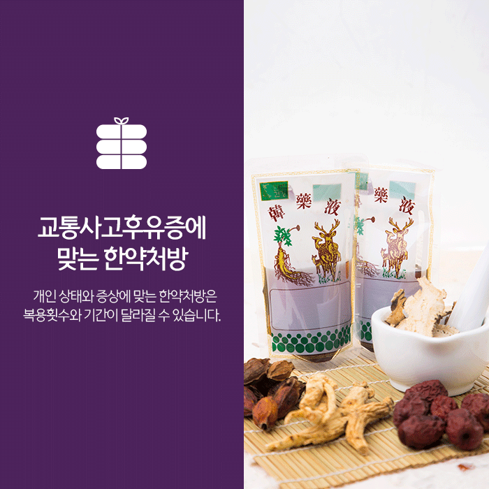 사고 후유증과 환자분 체질을 고려해 조제되는 한약은 어혈을 제거하고 기혈순환을 촉진해 염증과 통증을 완화합니다. 그리고 손상된 신체 조직의 재생과 함께 혈액을 생성해 면역력 향상과 전반적인 건강증진을 통해 교통사고 후유증 회복을 도와줍니다.