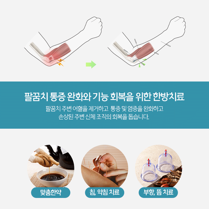 처방드리는 한약은 인증받은 약재를 사용하여 직접 제조합니다. 그리고 팔꿈치 통증원인과 동반되는 증상 등에 따라 복용횟수와 기간이 달라질 수 있습니다. 침 치료를 통해 혈자리를 자극하면 팔꿈치 주변 통증을 줄여주며 통증 및 부기완화에 도움이 됩니다.